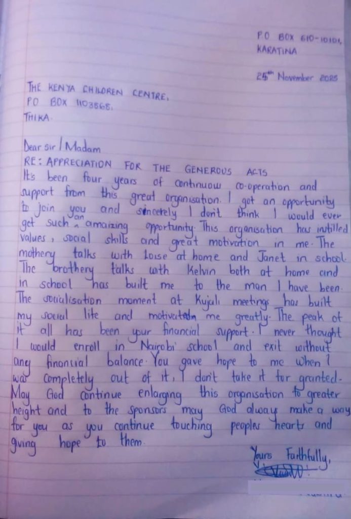 It’s been four years of continuous cooperation and support from this great organisation. I got an opportunity to join you and sincerely I don’t think I would ever get such an amazing opportunity. This organisation has instilled values, social skills and great motivation in me. The motherly talks with Loise at home and Janet in school, the brotherly talks with Kelvin both at home and in school has built me to the man I have been.